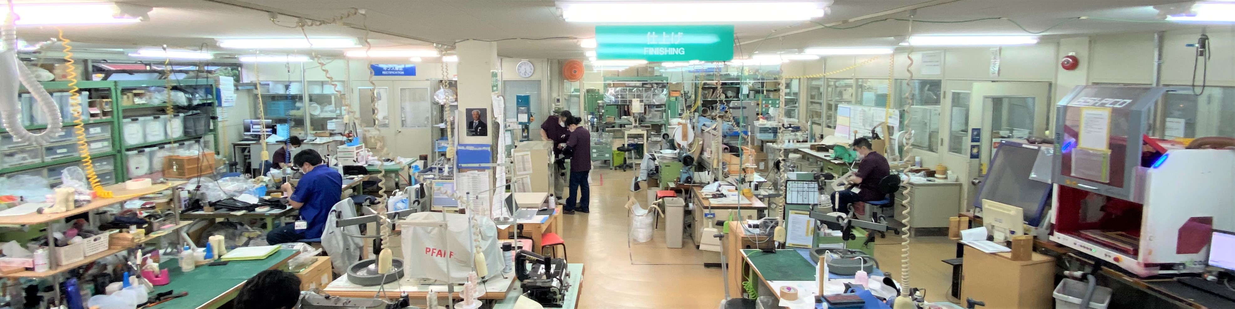 金属枠の上に皮革を貼りつけ縫製し不要な皮革をカットします。そしてベルトやクッションなどの取り付けを行います。 脊椎の装具は処方からお渡しまでが当日あるいは翌日となることもあります。手際の良さと速さが求められます。 フレームコルセットを完成させる班です。